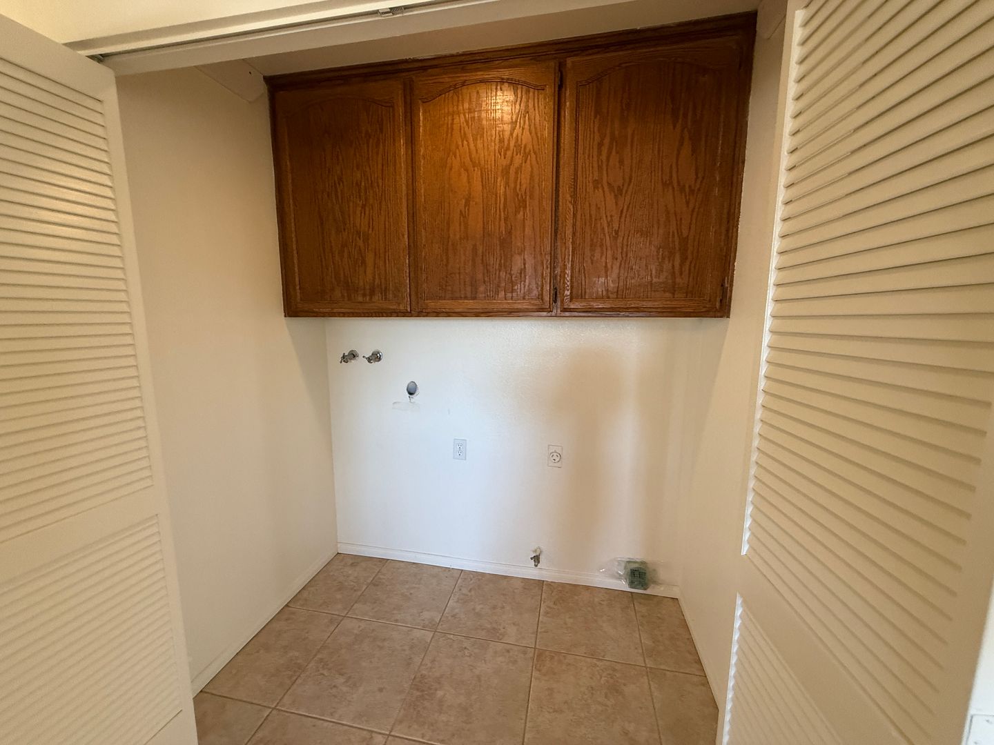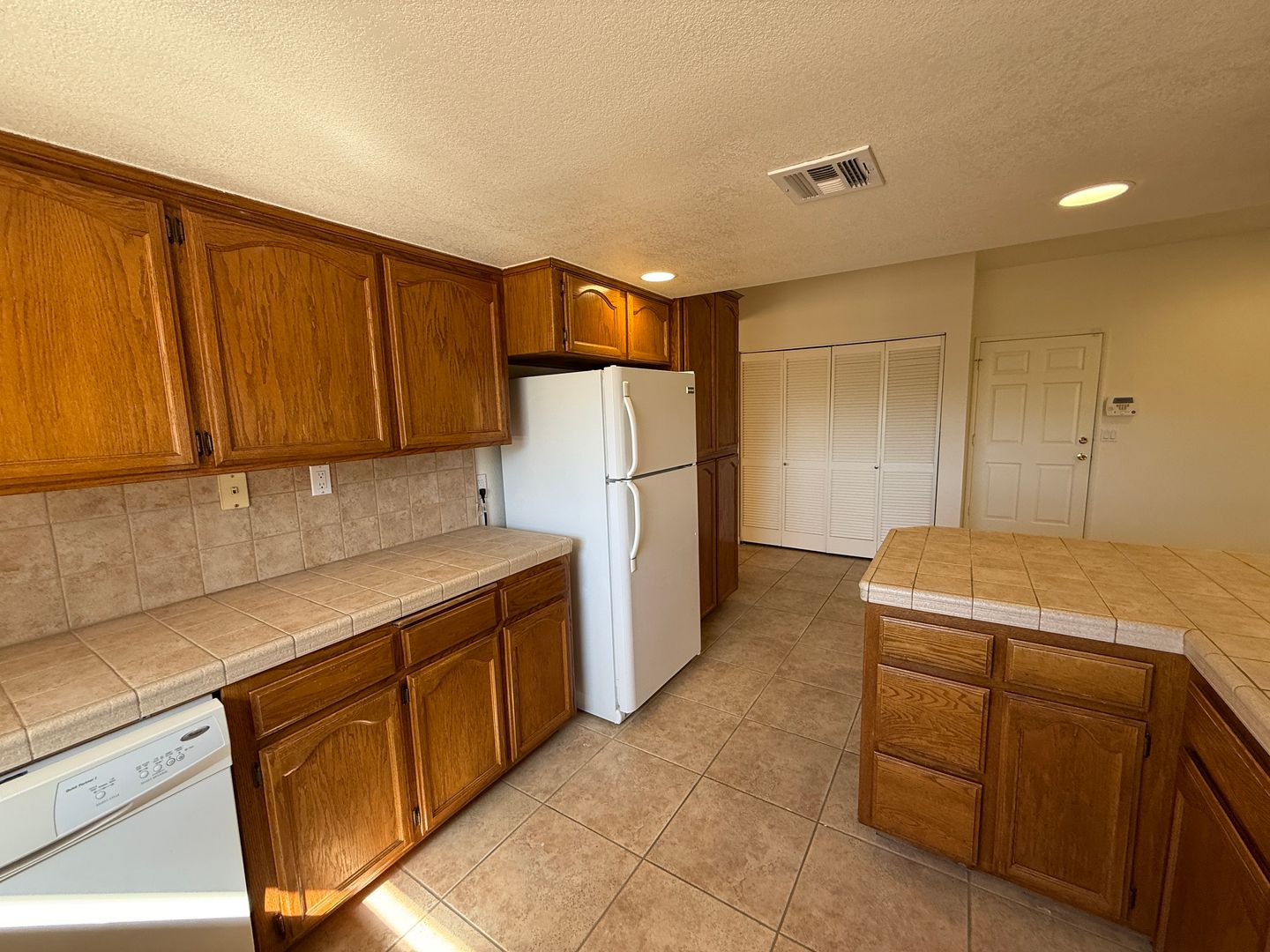 The kitchen is bright and cheerful, featuring white appliances, a planter window that overlooks the backyard, and ample cabinet space for all your culinary needs. A refrigerator is included (without warranty), and there’s an indoor laundry area with both gas and electric dryer hookups for your convenience.