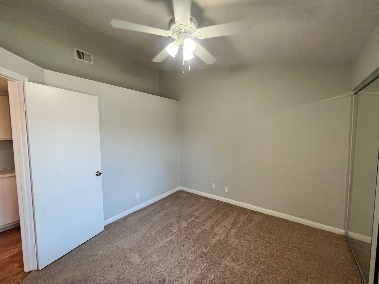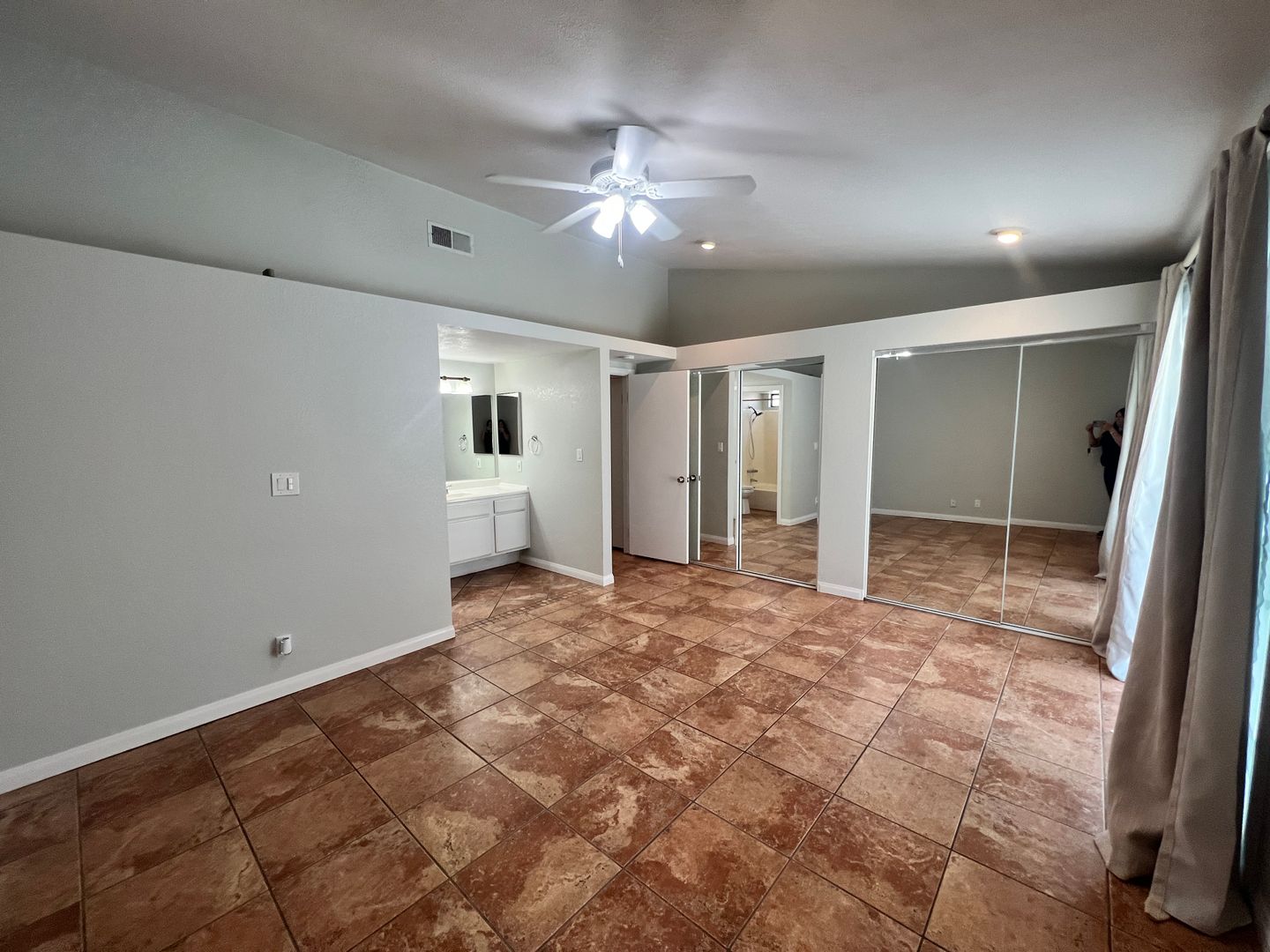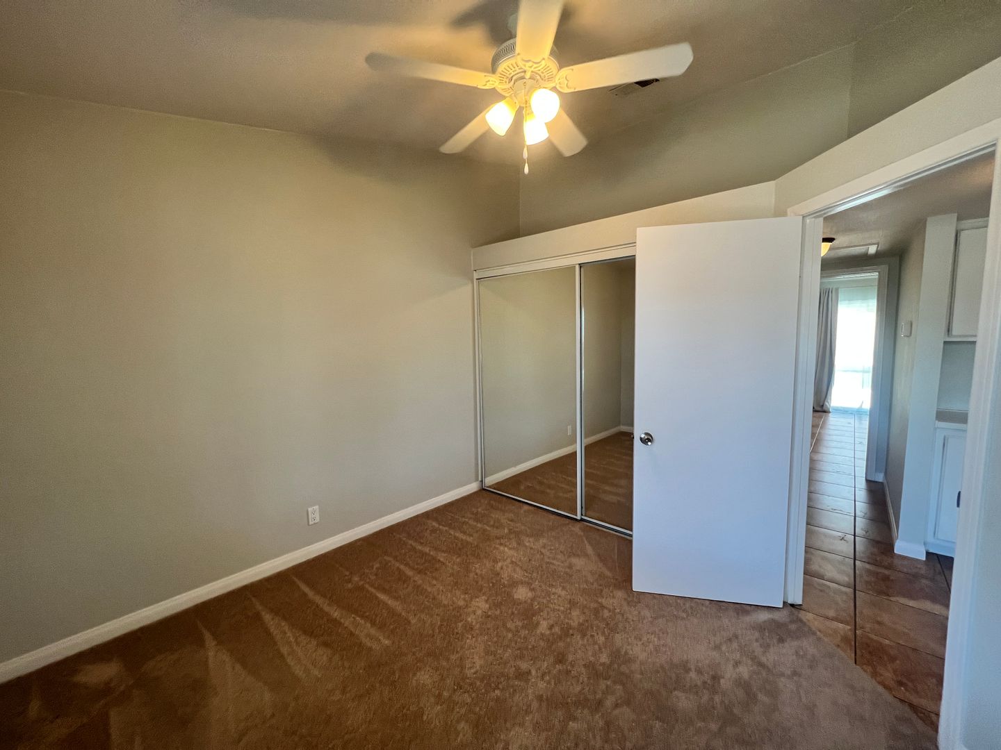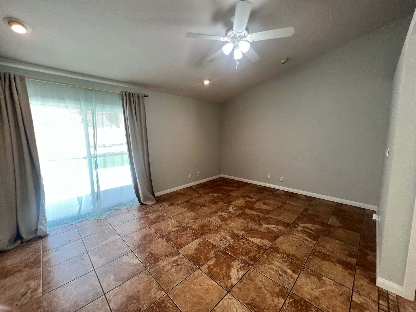 Ceiling fans are installed throughout the home to enhance comfort, and sliding glass doors from both the kitchen and the primary bedroom provide direct access to the backyard, allowing for plenty of natural light and easy indoor-outdoor living.