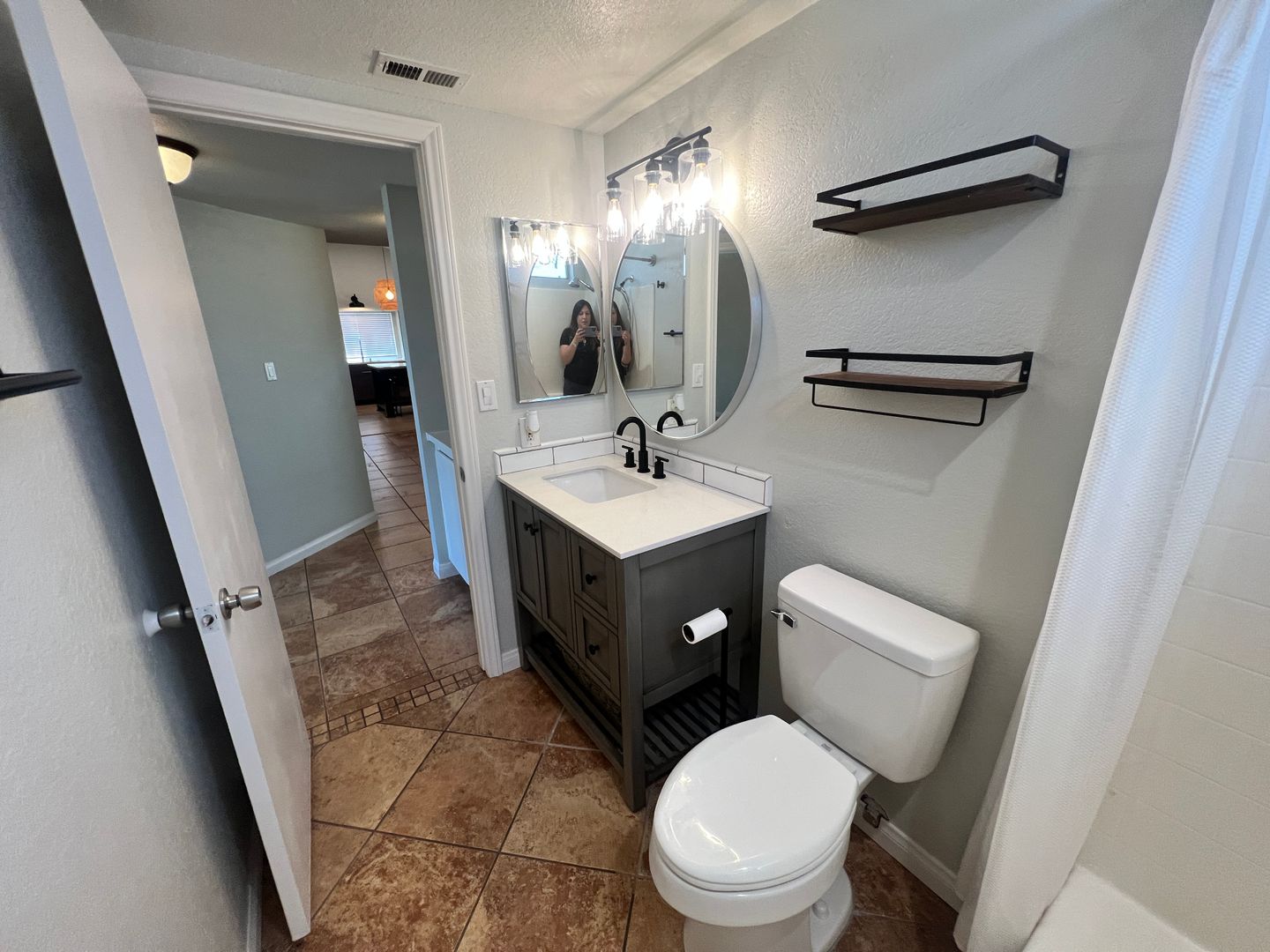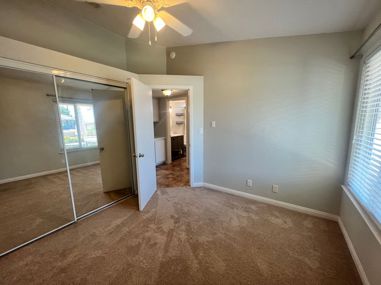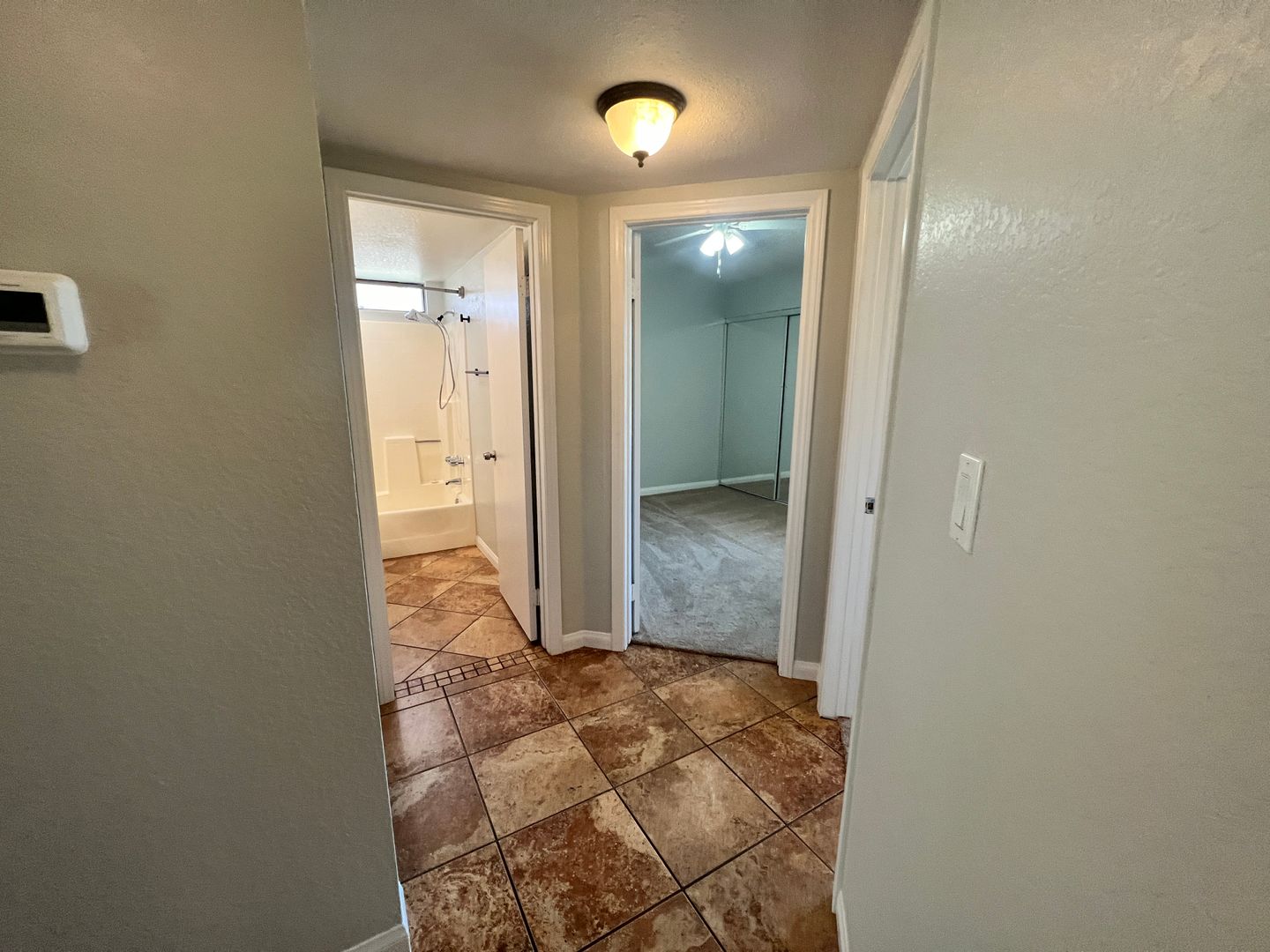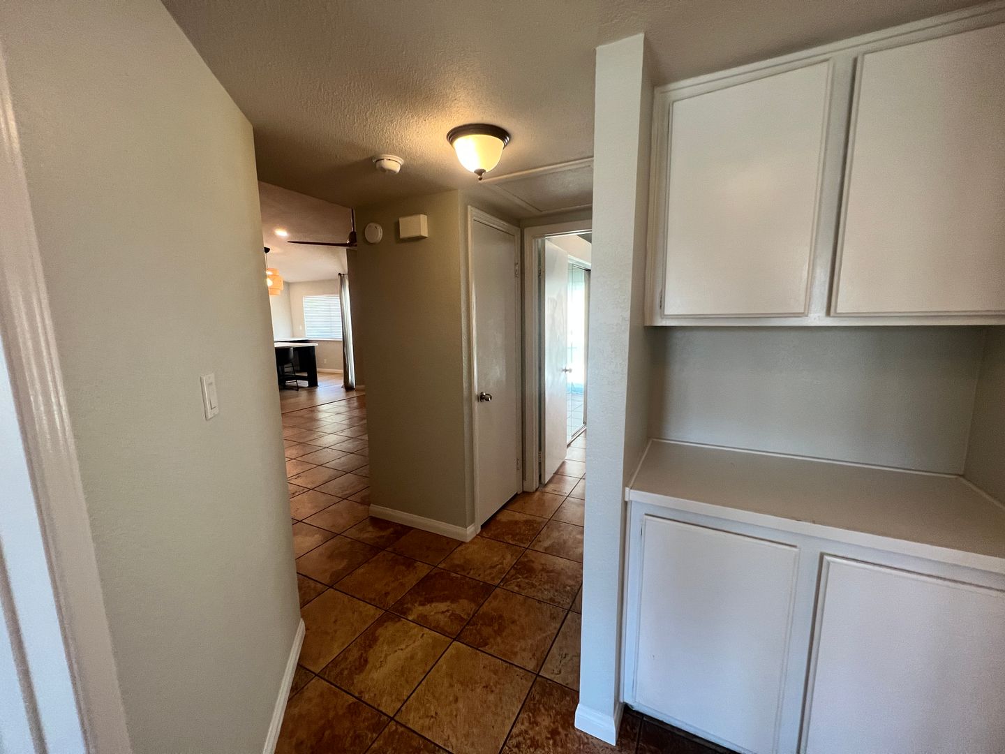 Ceiling fans are installed throughout the home to enhance comfort, and sliding glass doors from both the kitchen and the primary bedroom provide direct access to the backyard, allowing for plenty of natural light and easy indoor-outdoor living.