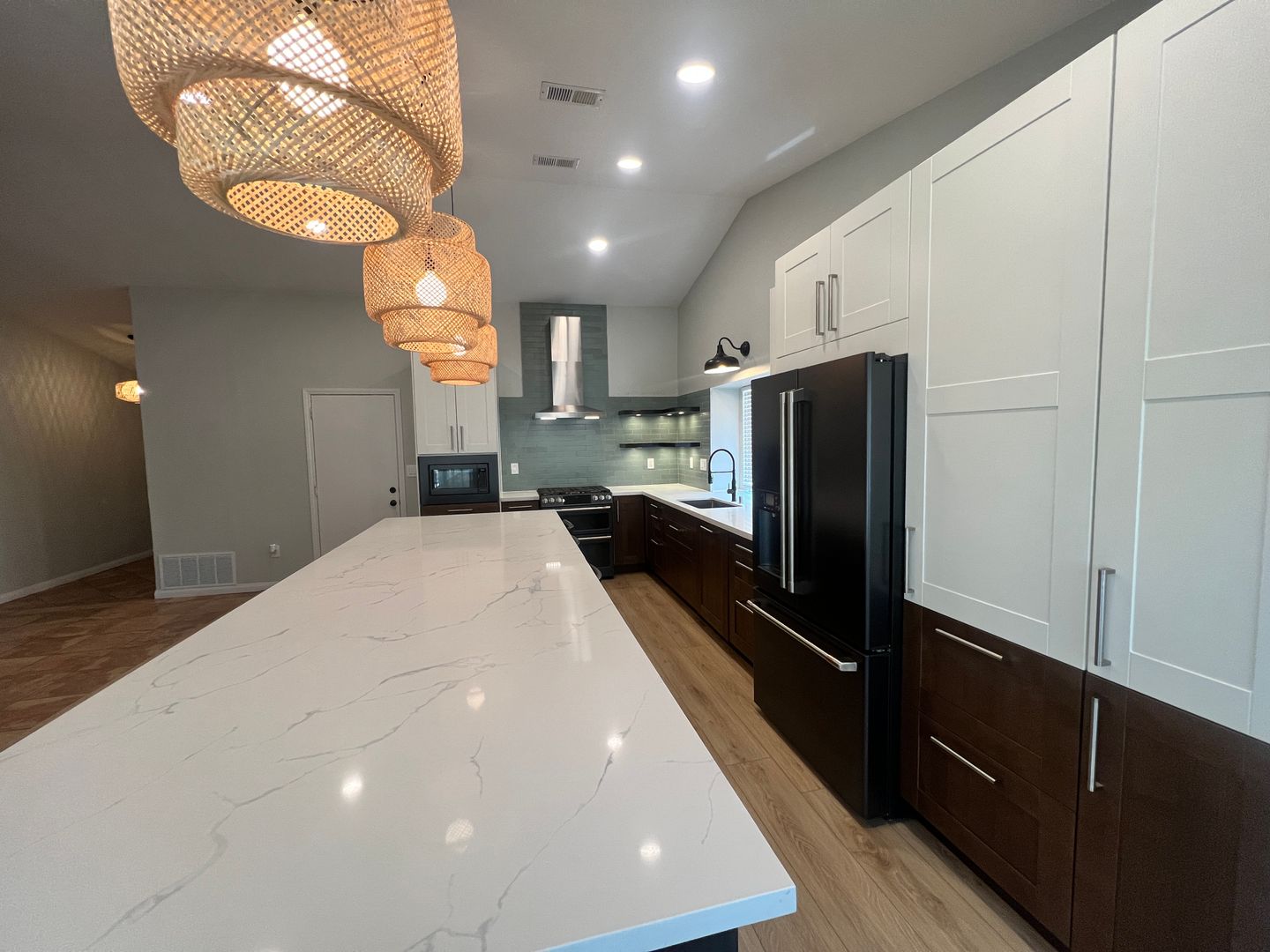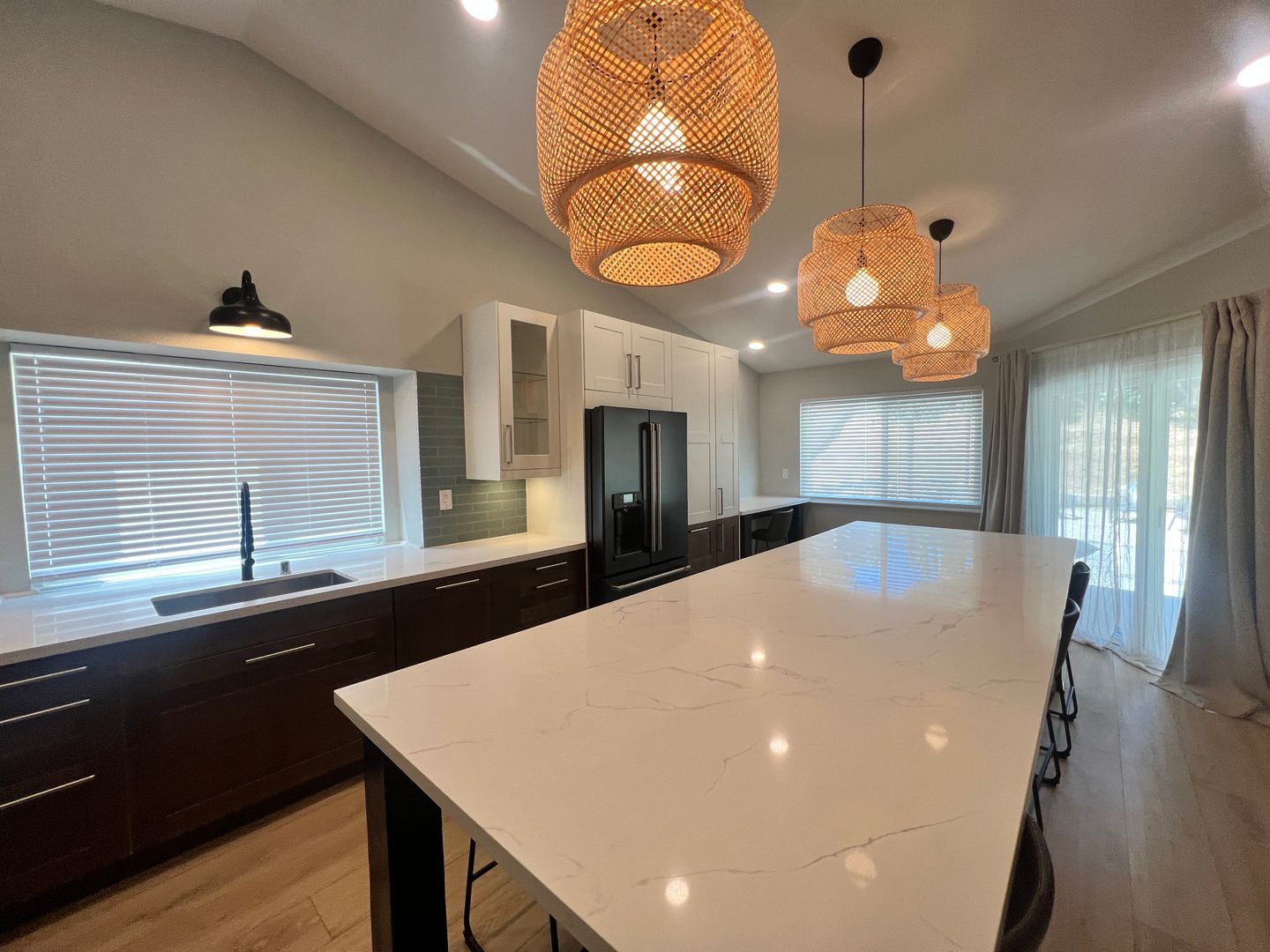 The heart of the home is the expansive kitchen, complete with elegant granite countertops and a large extended granite island with built-in seating—ideal for casual dining, meal prep, or gathering with friends and family. A refrigerator is included and comes with a warranty for added peace of mind. The open layout flows seamlessly into the living area, where a cozy fireplace creates a warm and welcoming focal point.