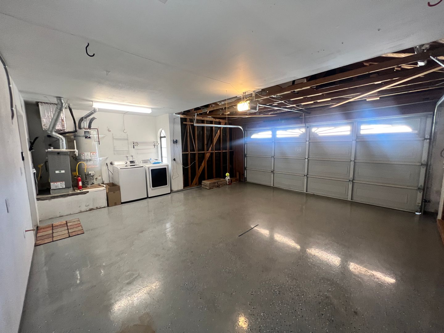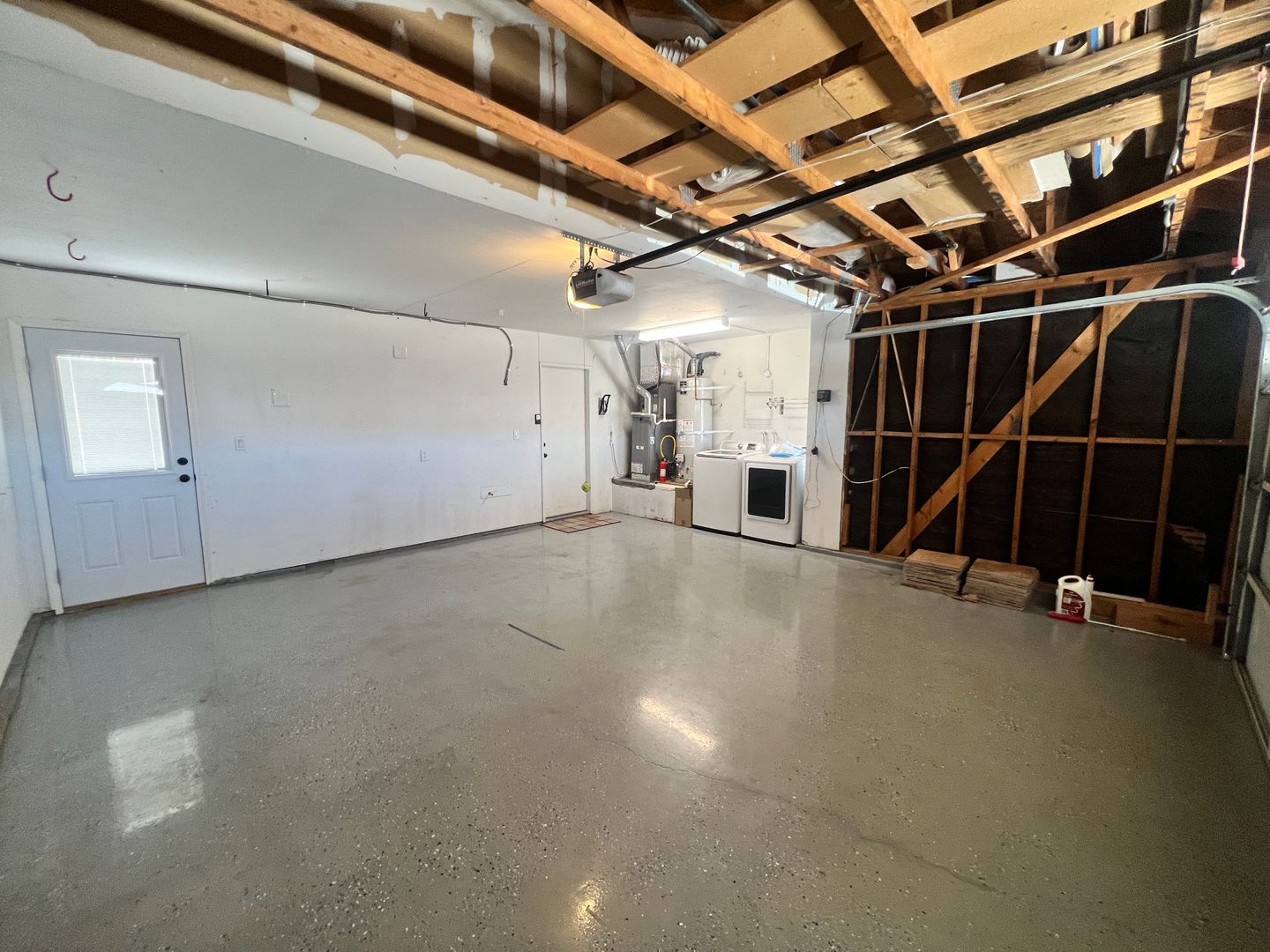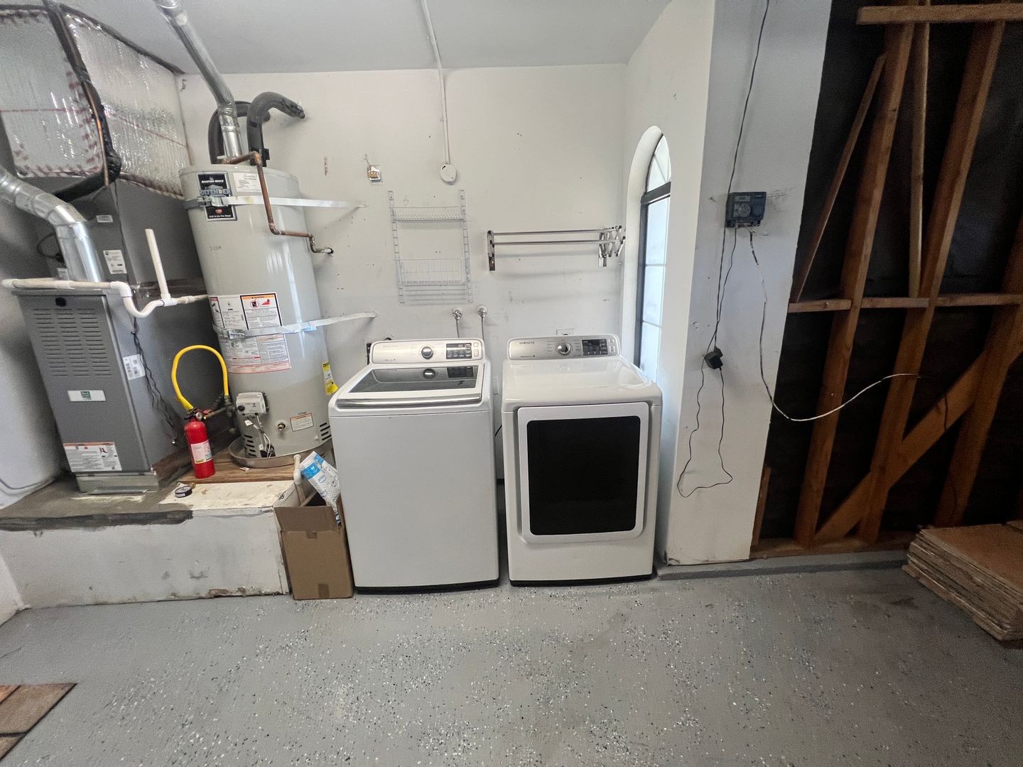 Additional conveniences include a two-car direct access garage with laundry area, complete with a washer and dryer (provided without warranty), as well as central heating and air conditioning to keep you comfortable in every season.