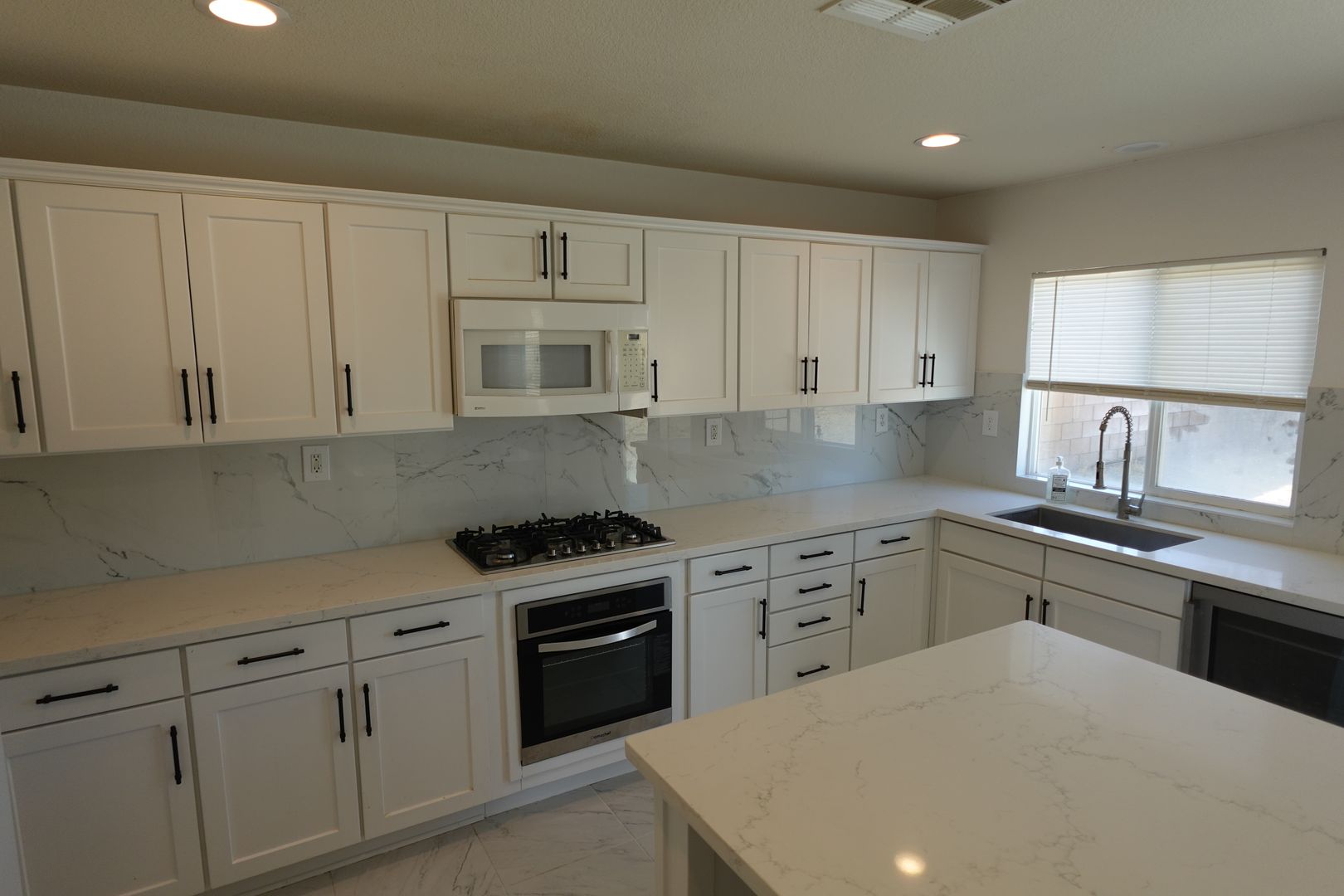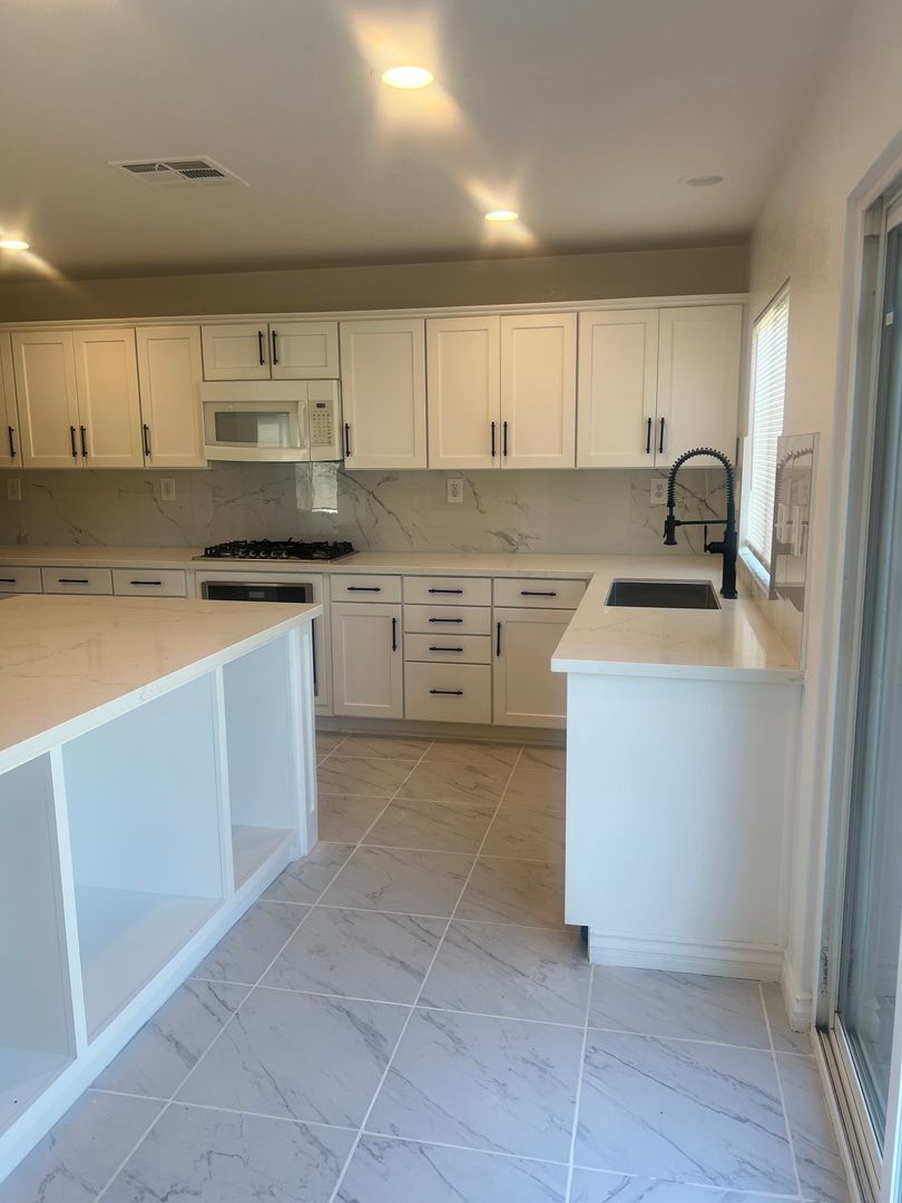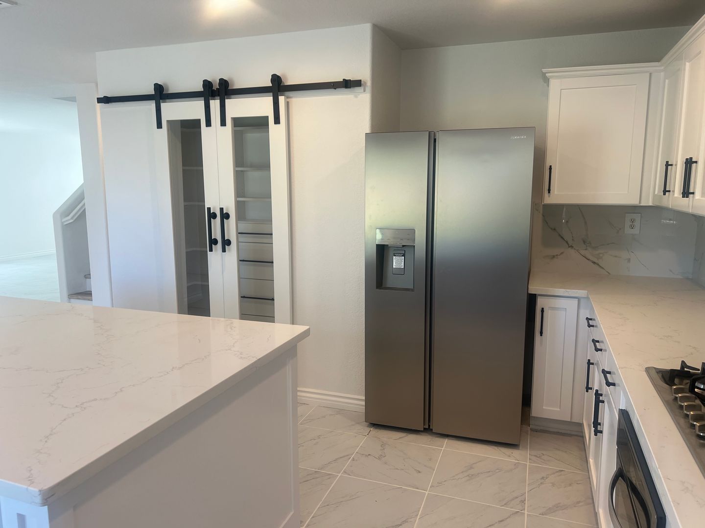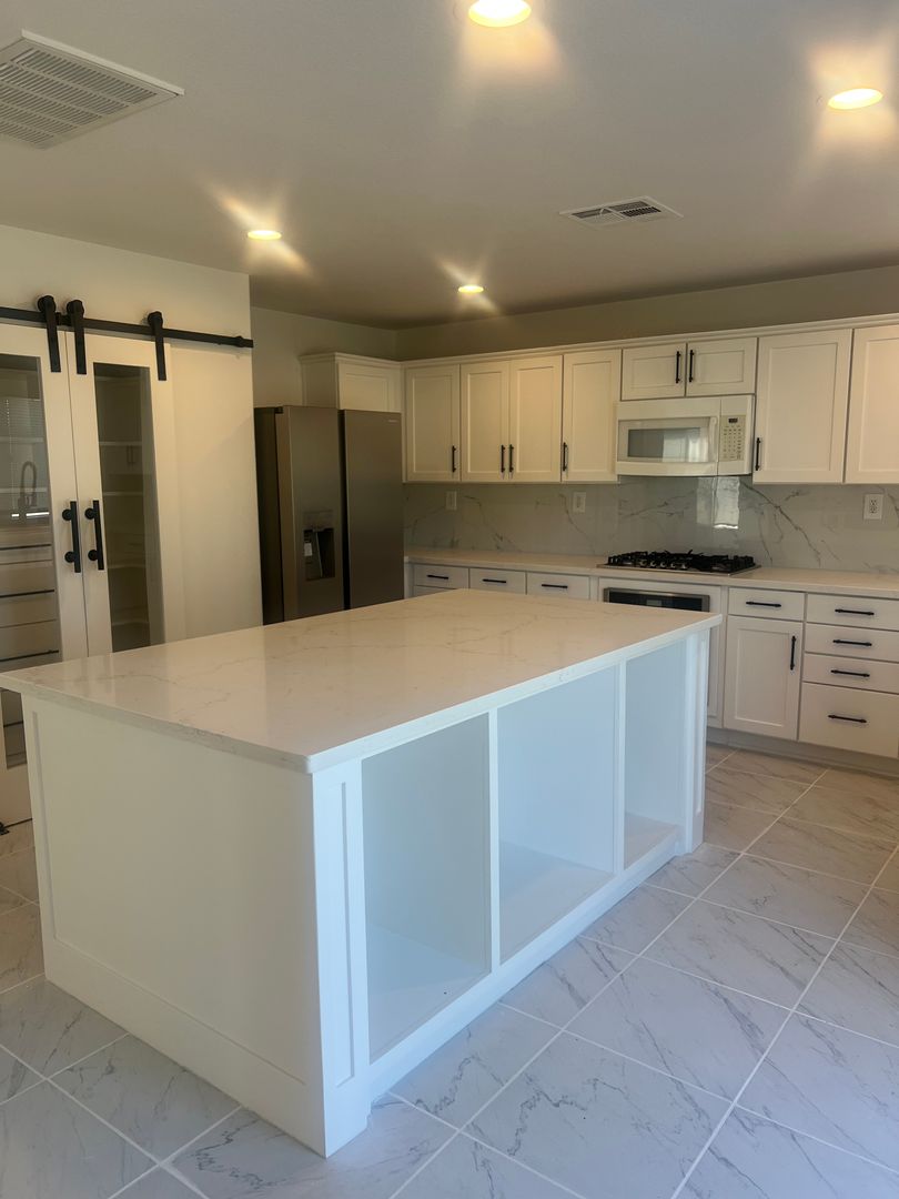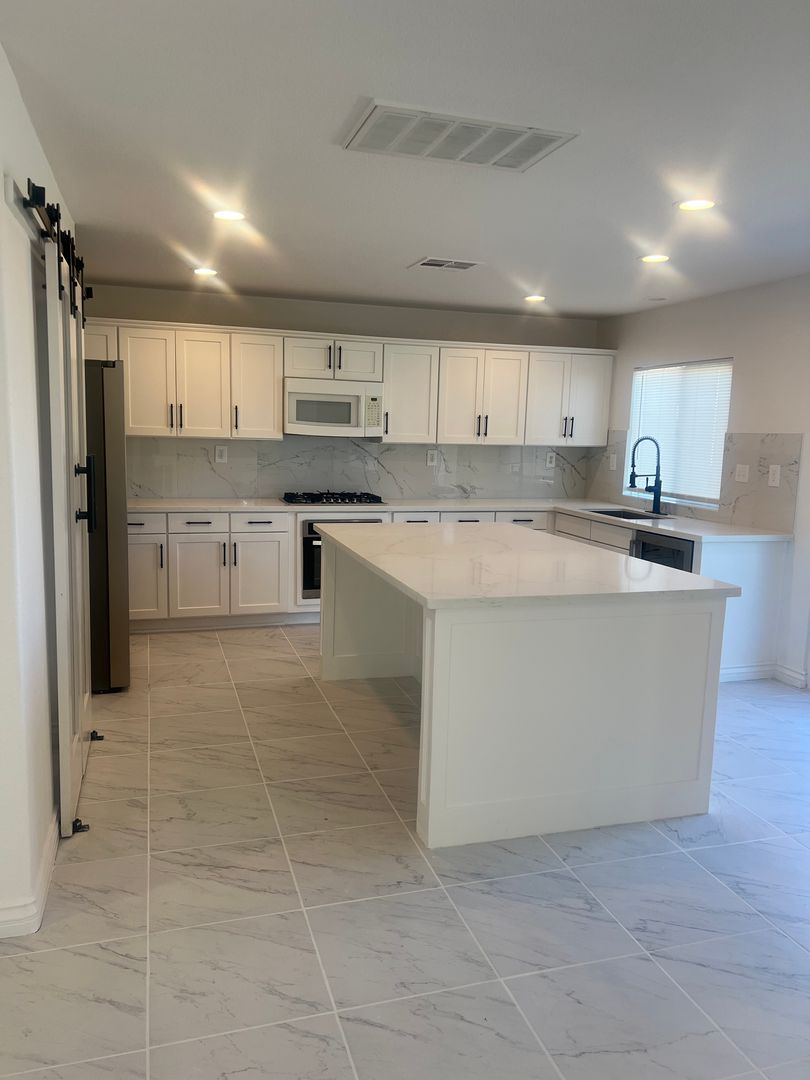 The updated kitchen features stainless steel refrigerator, gas cooktop, farmhouse sink, barn-door pantry and a large island ideal for meal prep or gatherings. Additional updated bathrooms, laminate wood and tile flooring throughout, neutral and new paint, and chandeliers add contemporary touches.