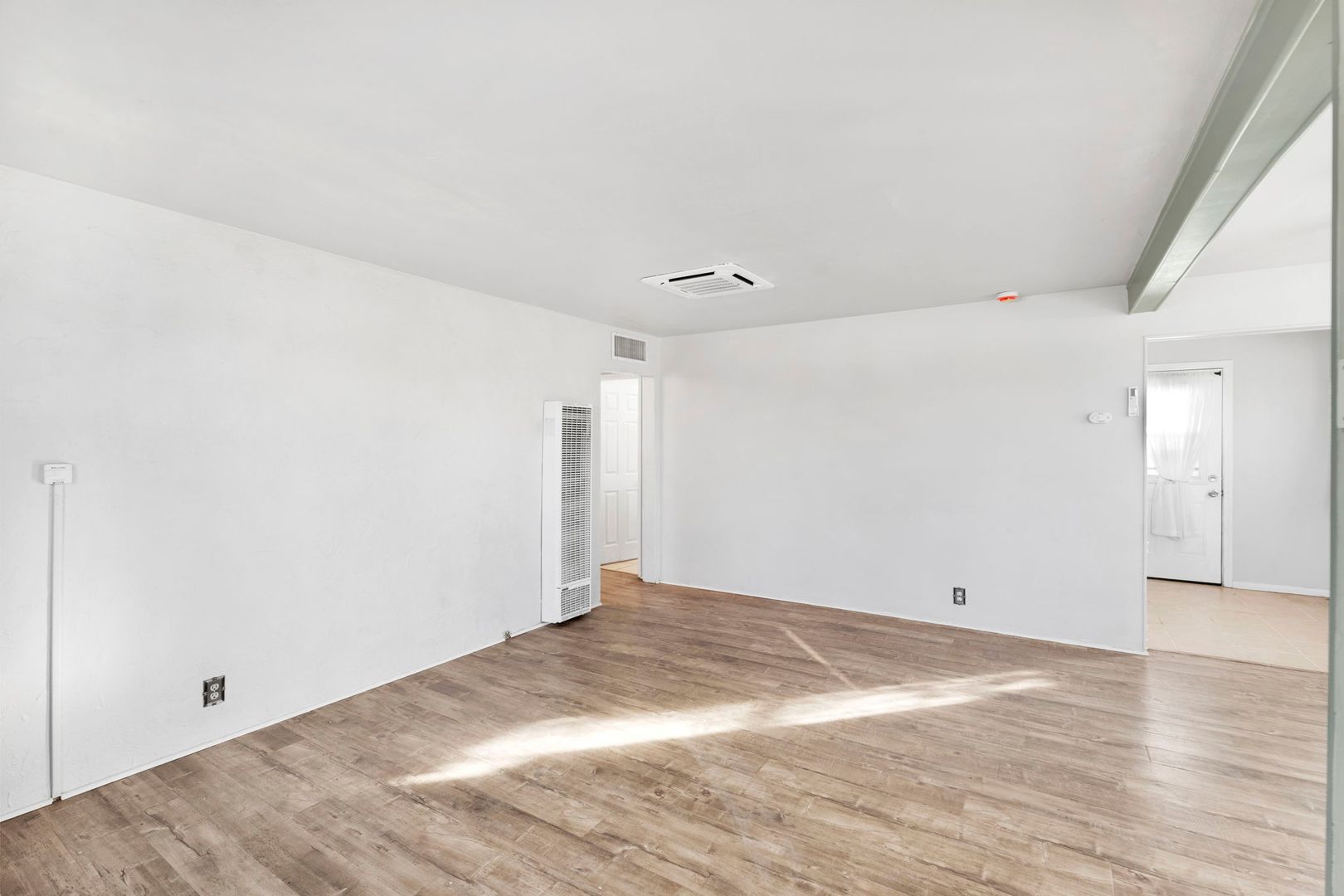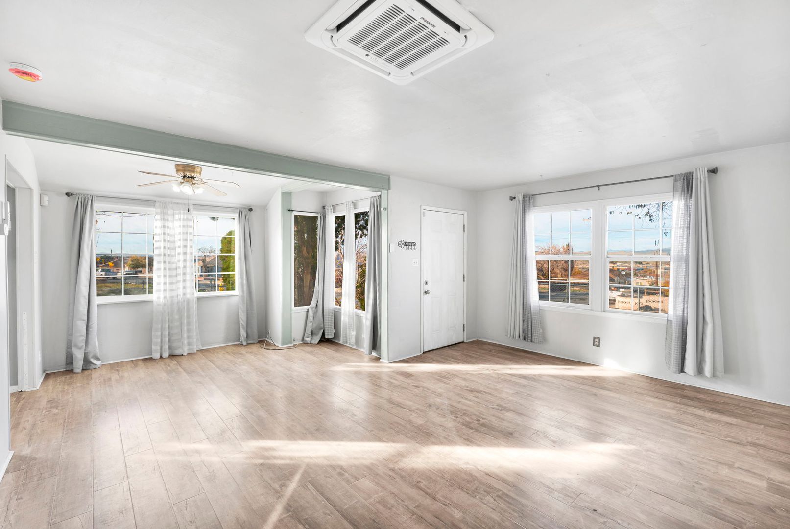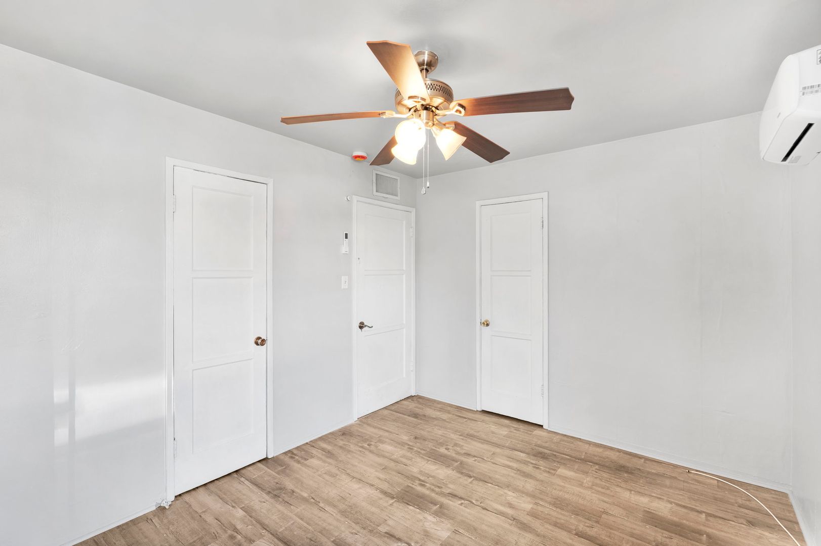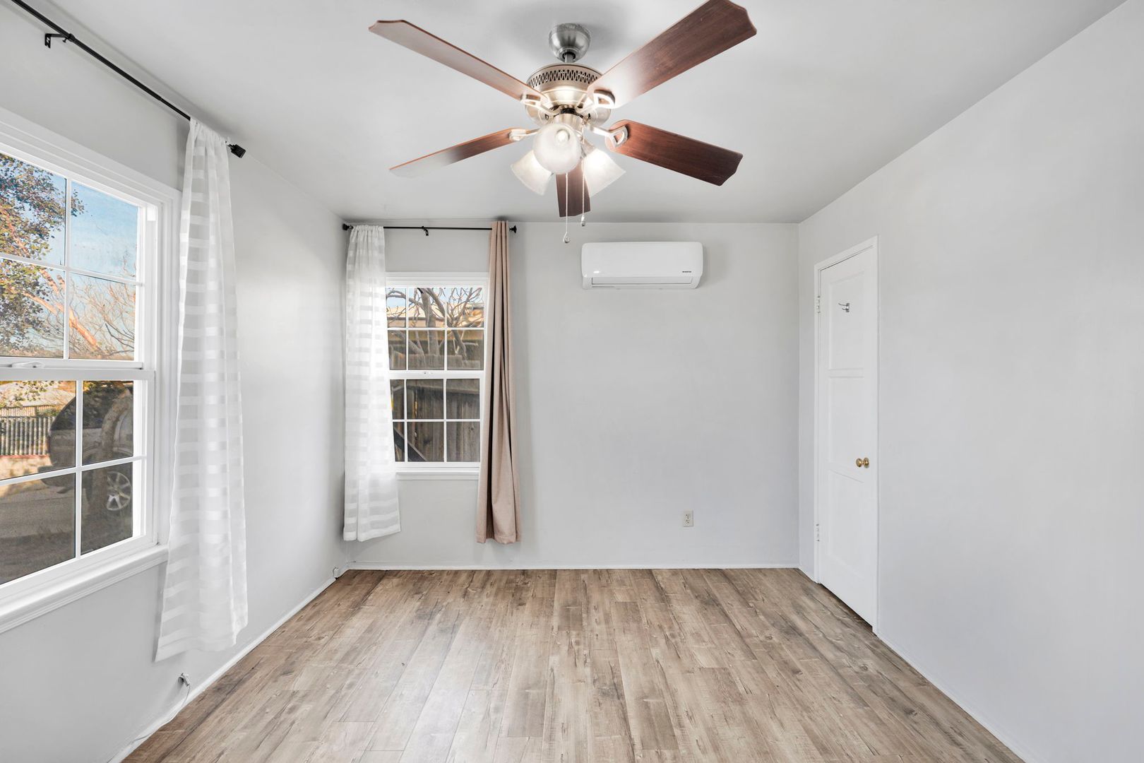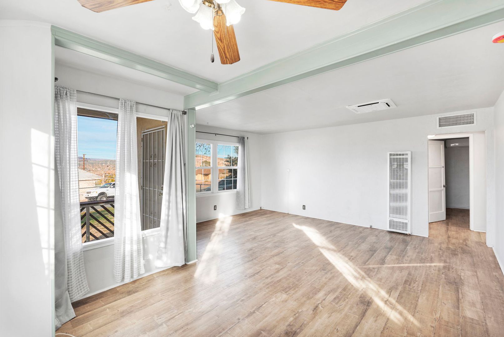 This corner lot property boasts a fresh coat of paint and laminate flooring throughout, creating a warm and inviting atmosphere. The home is equipped with ceiling fans and new mini splits throughout, ensuring comfort in every season.