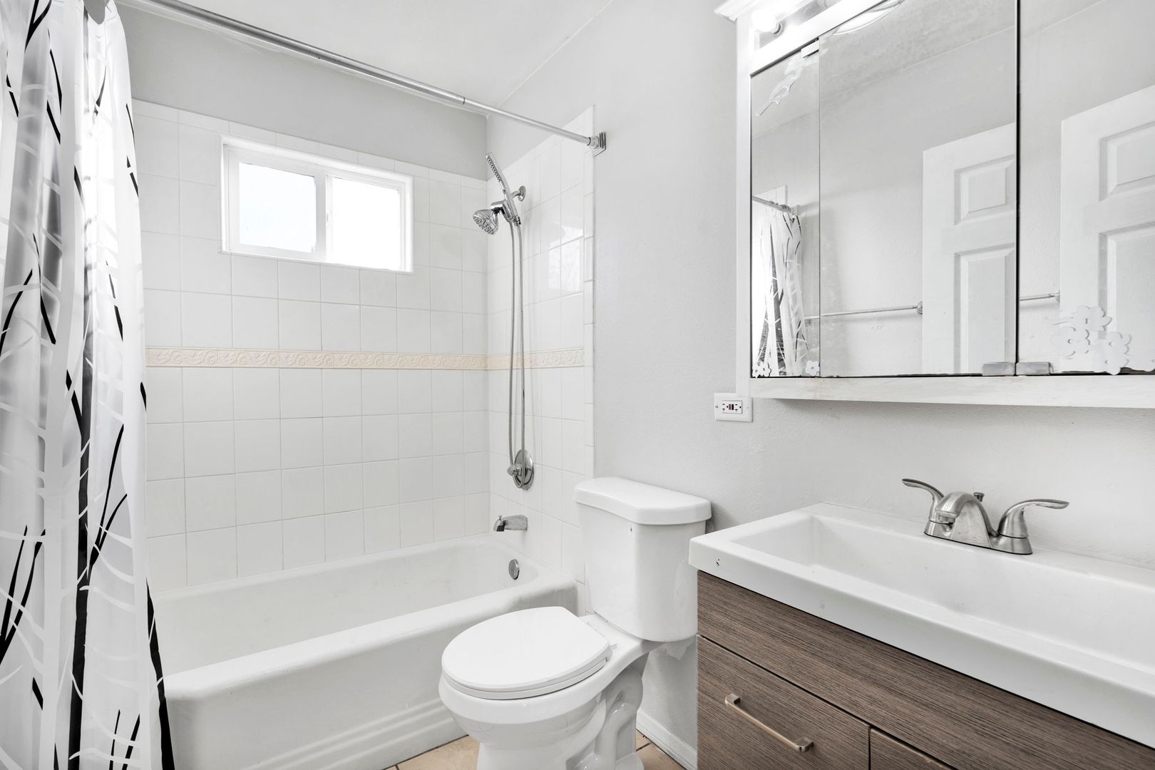 The bathroom features a modern new showerhead, adding a touch of luxury to your daily routine.