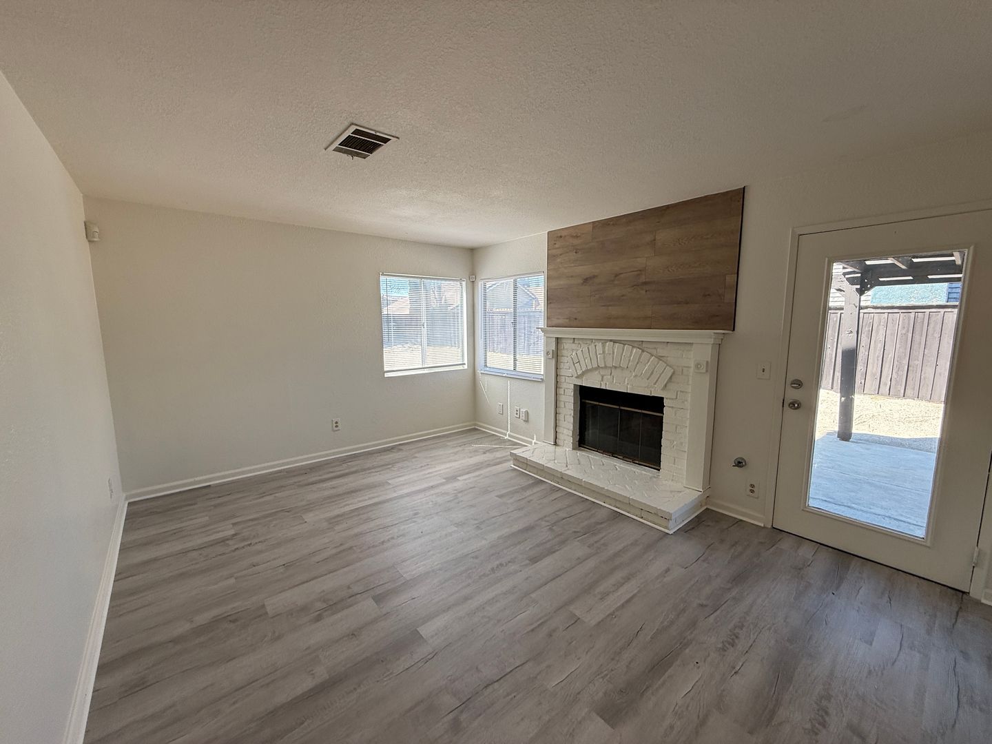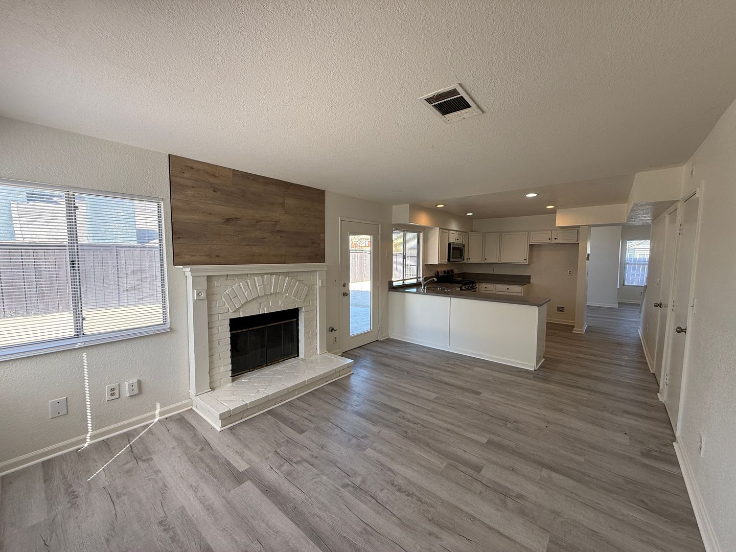Inside, you’ll find a thoughtfully designed interior featuring neutral carpet and durable laminate wood flooring, creating a warm and versatile backdrop for any décor style. The living area is anchored by a charming brick fireplace, perfect for cozy evenings or relaxed gatherings.