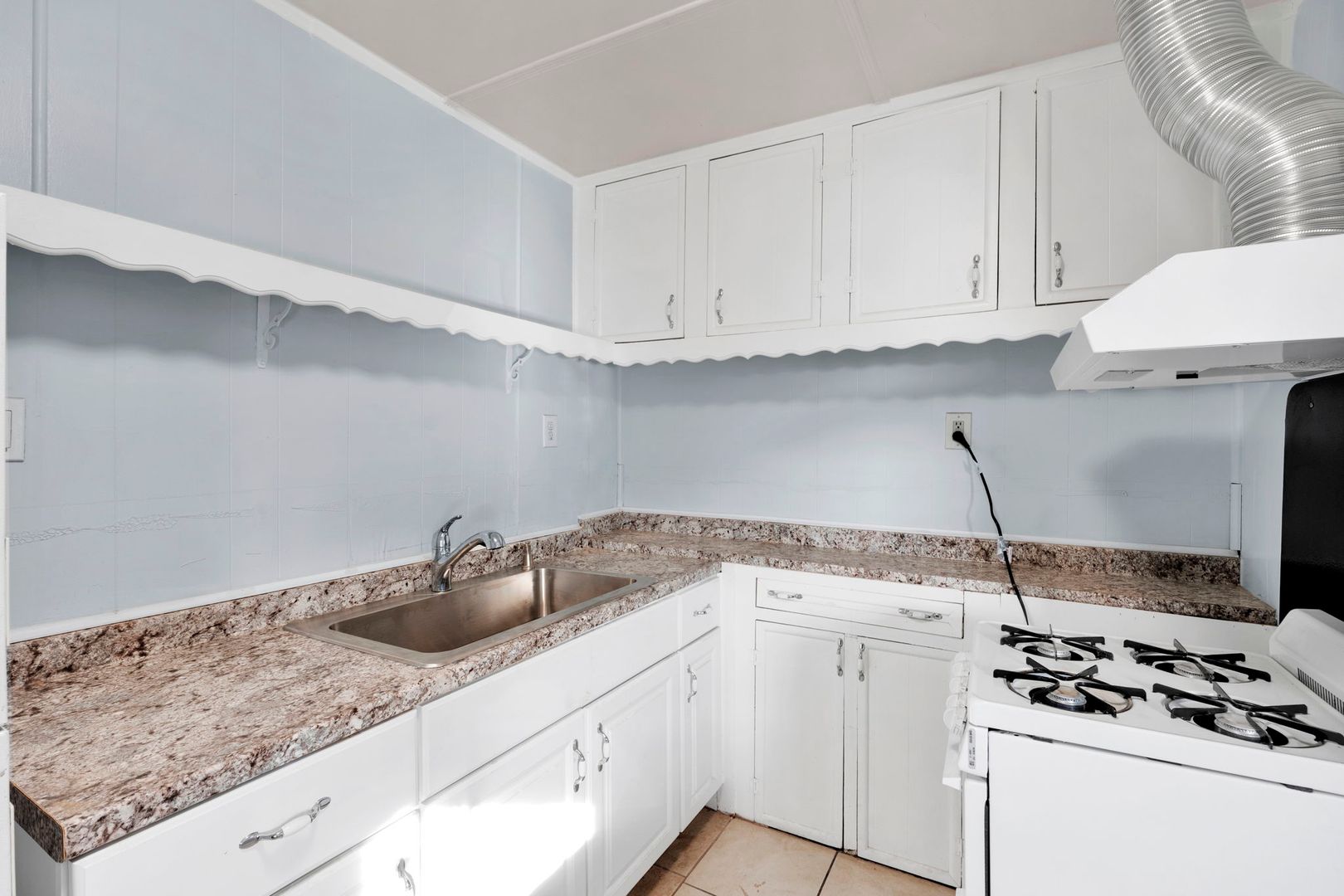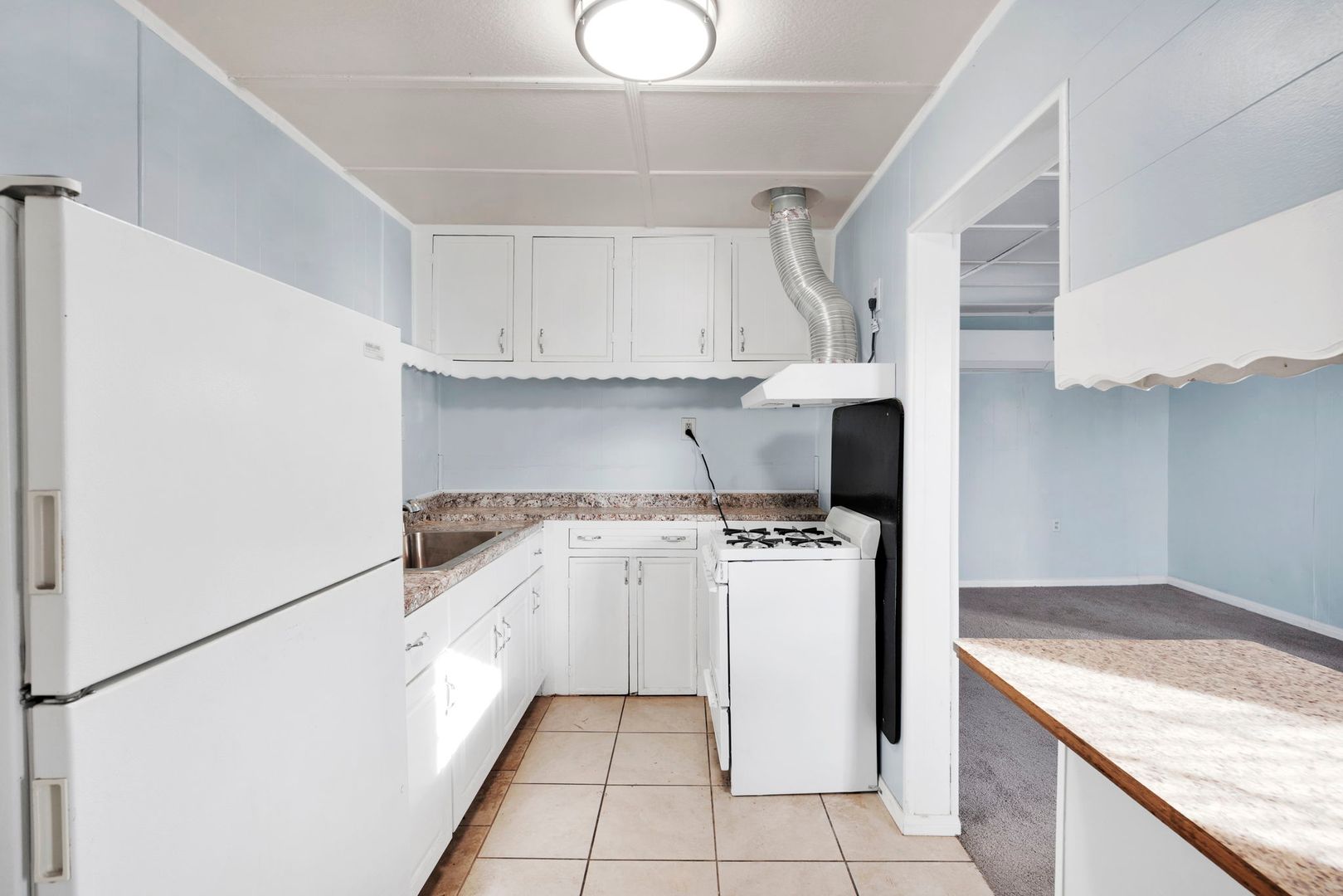 This corner lot property boasts a range of amenities designed for comfortable living. The kitchen is equipped with a gas range, refrigerator, and a breakfast bar, perfect for those who love to cook.