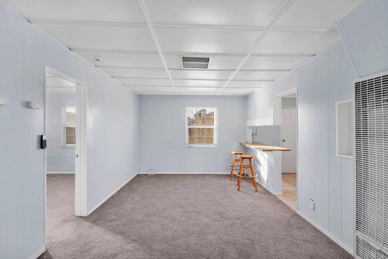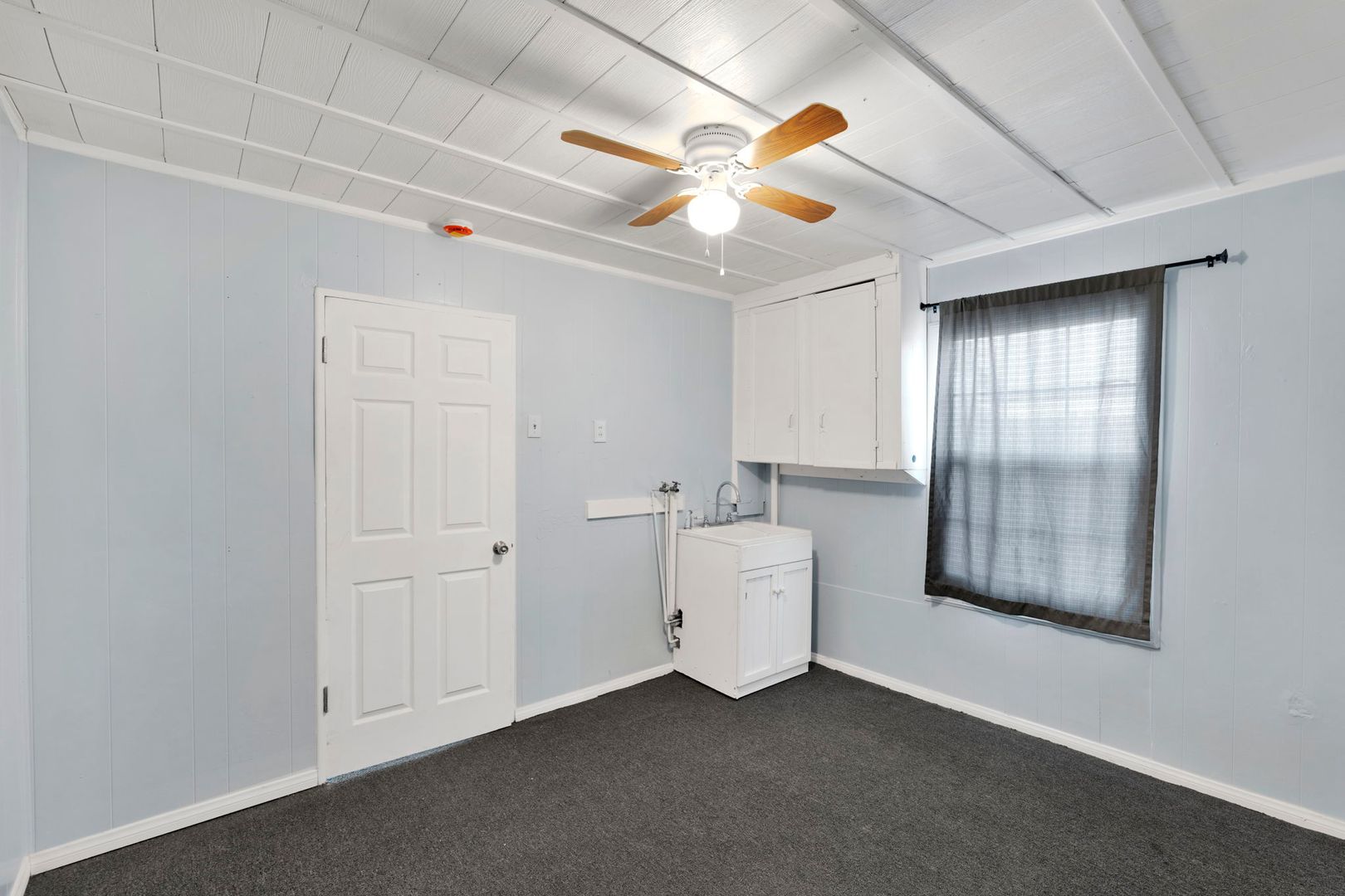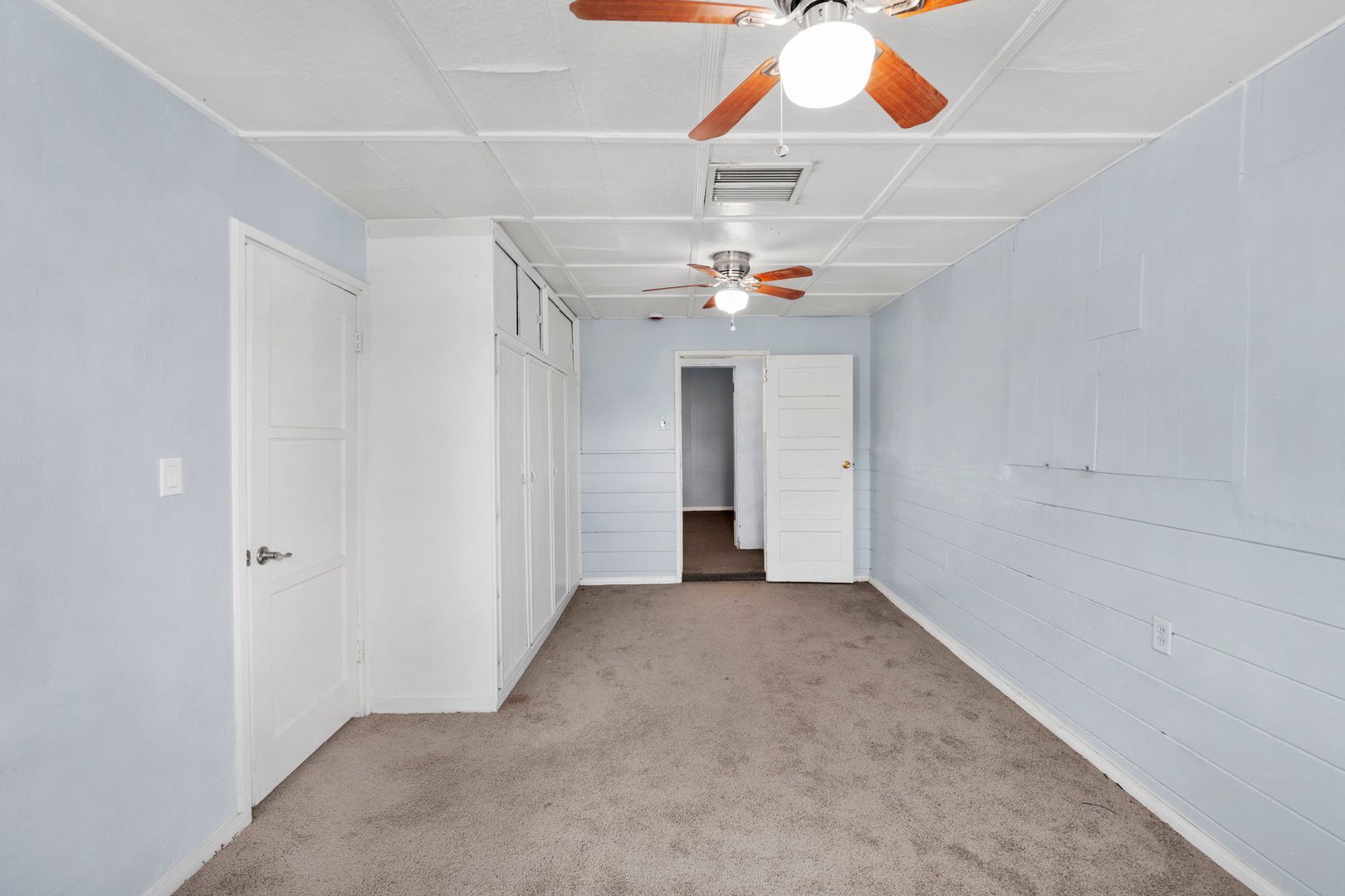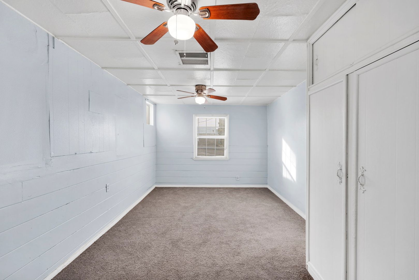 The home also features carpet flooring and ceiling fans throughout, ensuring a cozy atmosphere all year round. The large bedroom comes with a spacious closet, providing ample storage space.