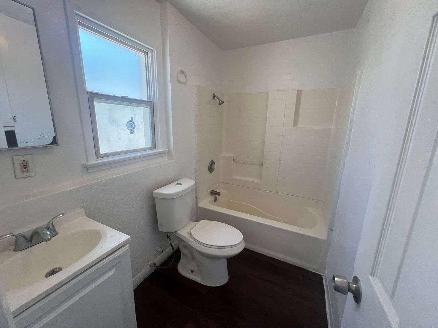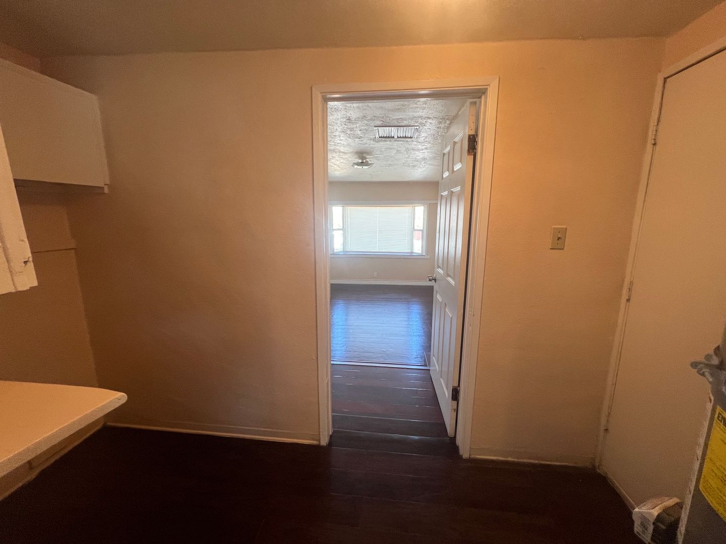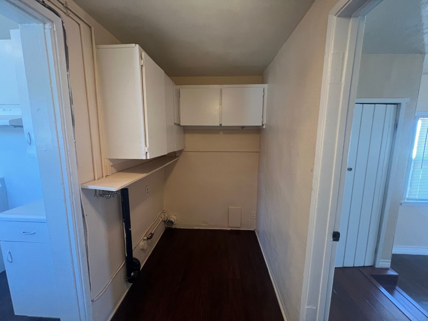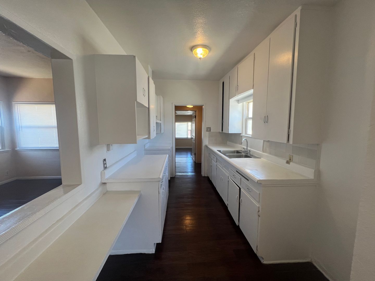 This property boasts a fresh coat of new paint and beautiful wood flooring throughout, creating a warm and inviting atmosphere. The white kitchen cabinetry in the galley kitchen adds a touch of elegance and sophistication.