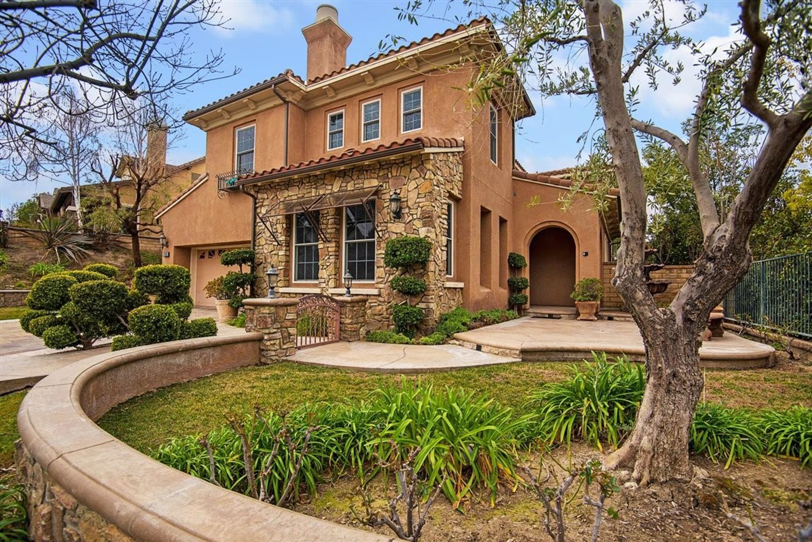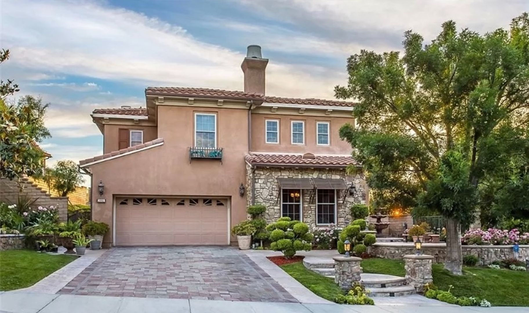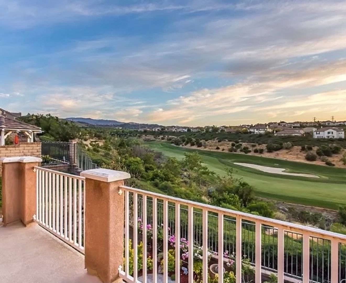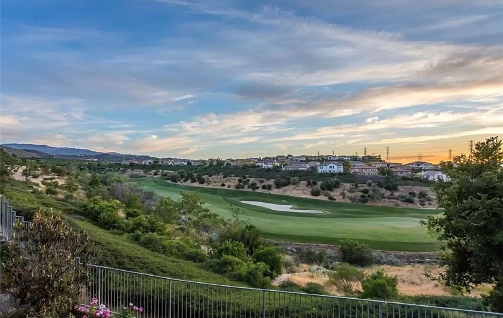 5 Bedrooms (3 have en-suite Bathrooms), 4.5 Bathrooms, 3385 sq. ft. The entire back of this home features breathtaking views of The Oaks Club at Valencia golf course. Highly desired floor plan offers a downstairs bedroom w/full en-suite bathroom. There are two fireplaces, one in the formal living room and one in the family room. The kitchen has granite counters, a center island, built-in refrigerator, double oven, and a butler's pantry. The upstairs master bedroom and bath runs along the entire back of the house. There is a balcony with it's own entrance off of the master dressing area. Master bath has double walk in closets with built-ins, a large bathtub and separate shower. Hardwood flooring downstairs and upper loft area, built ins throughout the upstairs and downstairs. The front courtyard area has a beautiful fountain and backyard with a beautiful serene running waterfall and two large seating areas. Close proximity to freeway, shopping and award winning schools!