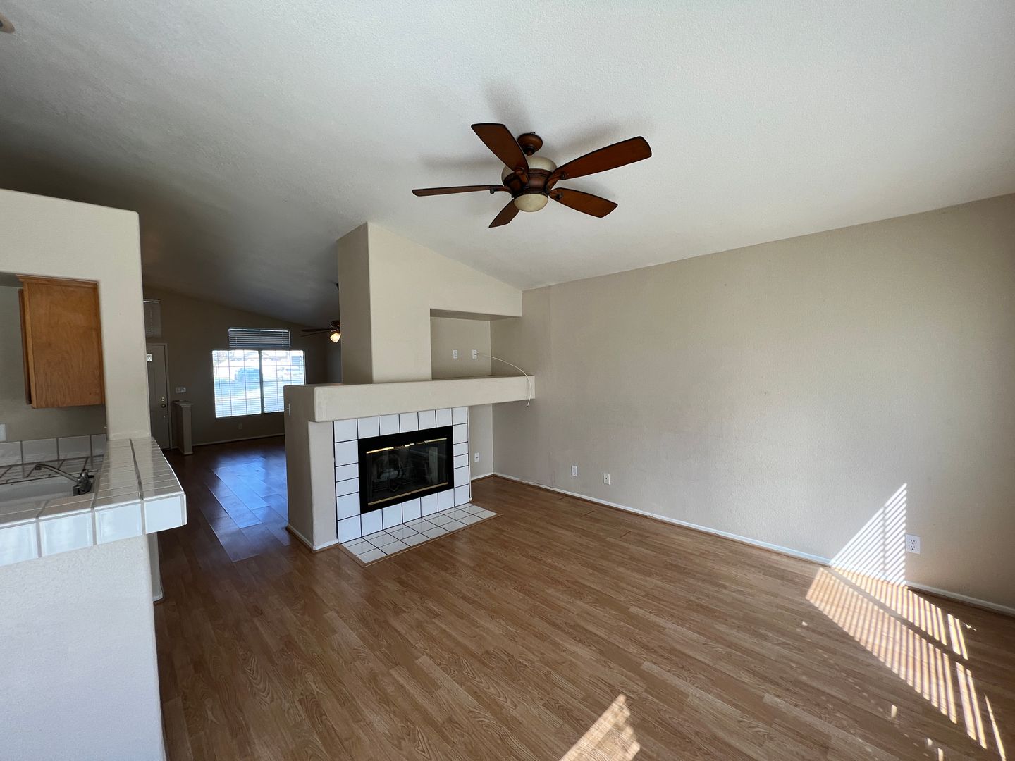 Step inside to find a bright and open living room featuring a cozy gas fireplace, perfect for relaxing evenings or gathering with family and friends. The kitchen is equipped with tile countertops and includes a refrigerator with warranty, providing both style and peace of mind. A sliding glass door just off the kitchen leads to the fully fenced backyard, creating an easy indoor-outdoor flow ideal for entertaining or enjoying quiet mornings.